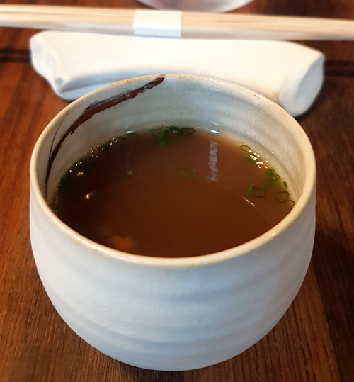 der mit köstlicher Misosuppe gefüllt war, darin enthalten Fäden von