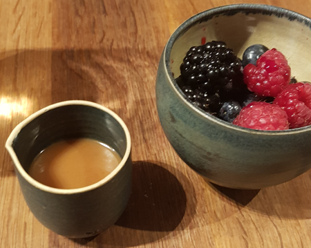 Soft-Karamell mit Molke und geräucherter Butter, frischen Beeren mit