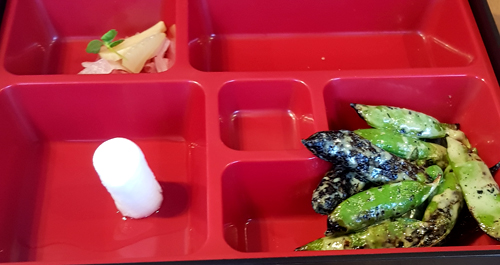 Bento-Box. Darin ein Esslöffel voll Tsukemone, als würzig eingelegter