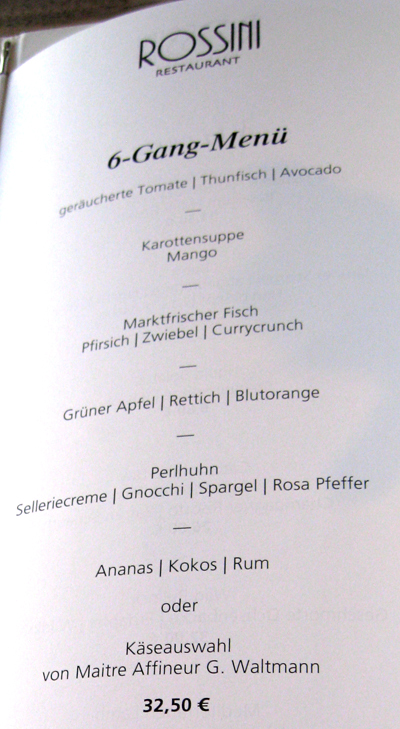 Nur Mut!, möchte man der jungen Küchenmannschaft zurufen - ihr habt so wenige Gäste, da könnt ihr ruhig etwas wagen. Im Gourmetrestaurant muss es nicht allen Passagieren munden (die meisten kommen ja ohnedies nicht) und wer ins Rossini geht, will im allgemeinen ganz bewusst dem Einheitsgeschmack der Buffets entfliehen.