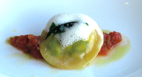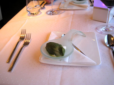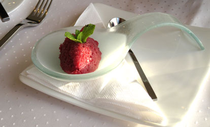 Als kleinen Extragang - bei 8 Gängen ist schließlich noch Platz - haben wir uns ein Basilikumsorbet mit Minze auf Sauerrahm bestellt - ein köstlich erfrischender, bemerkenswert konzentrierter Genuss, der allerdings nicht jedem schmeckte und der auch mit dem Geschmack von Kaugummi verglichen wurde.
