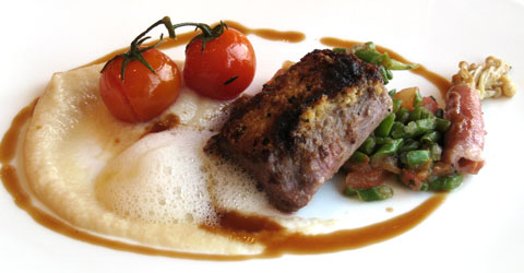 Rosa Lammrücken unter der Olivenkruste an Pastinakenpanache, Enoki und Bohnenragout