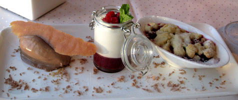 Gebackenes Beerenragout mit Streusel an Pralineneis und Kokosmousse