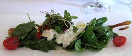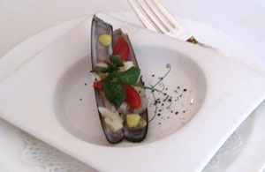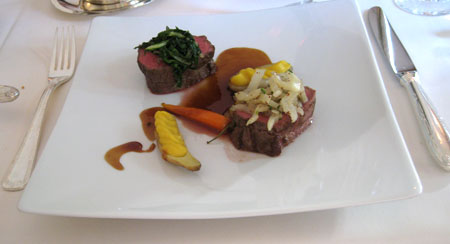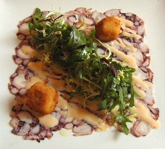 Trotz der Renovierungsarbeiten im Hotelbereich und trotz eines fehlenden Spitzenkochs als Aushängeschild lohnt der Besuch des Restaurants seit Mitte 2010 wieder, zum Beispiel wegen dieses wirklich wunderbaren Carpaccio vom Oktopus mit gebackenem Croustillion auf Hummermayonnaise und Rucolasalat: