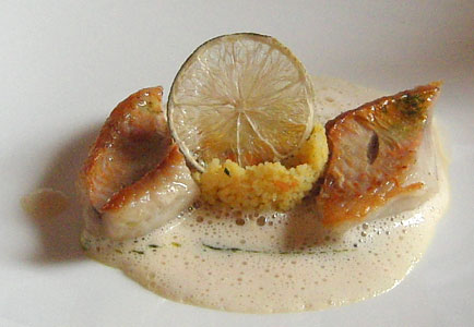Oder wegen dieses saftig gebratenen Rotbarbenfilets auf Raz el Hanout Cous Cous und Limonensauce. Ich mag sonst kein Cous Cous, aber dieses war großartig, leicht körnig und phänomenal gewürzt: