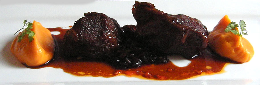 Herrlich zart, auf den Punkt gegart und in einer Qualität, die Normalbürger im Supermarkt niemals erwerben könnten: Geschmortes Kalbsbäckchen mit Schalottenmarmelade und Süßkartoffelpüree.
