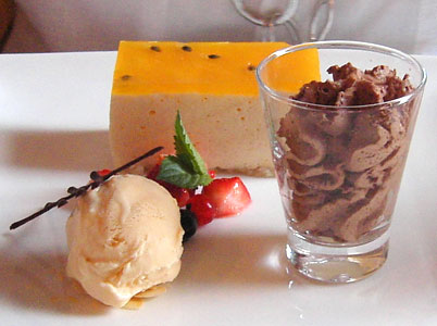 Der Nachtisch erwies sich nicht nur als Augenweide, sondern als zwar lecker, aber konzeptionslos. Die Passionsfrucht-Kokosschnitte war viel zu üppig bemessen, ein Drittel davon hätte vollauf genügt. Das Zitronengras-Eis ging zwar sehr feinaromatisch in die Nase, passte aber nicht recht zum Kuchenstück. Luftig und filigran-schokoladig der Schokoladen-Chilischaum im Glas, aber im Abgang eine enorm scharfe Chiliorgie, die man Kindern und Leuten, die sonst nicht scharf essen, nicht ohne Vorwarnung servieren sollte. Mir hat's allerdings gemundet!