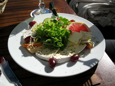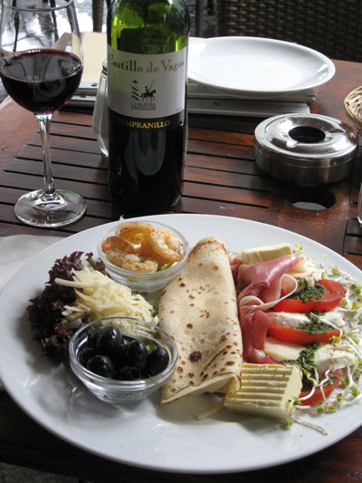 Sehr empfehlenswert auch der reichliche Vorspeisenteller mit warmem, kräutercremegefülltem Quark und frisch gebratenen Scampis, allerdings bleibt danach kaum noch Platz für einen Hauptgang: