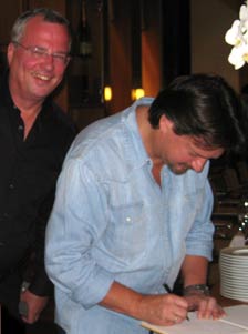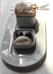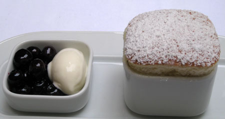 Tarte Tatin mit eingelegten Rum-Rosinen und Balsamicoeis als Nachtisch war ganz gut, ohne aber wirklich herausragend zu sein oder gar nach Wiederholung zu schreien (15,- EUR). Die volle Punktzahl gibt es allerdings für das Soufflé von Limone und Thymian mit Sauerrahm und eingelegten Kirschen, die in der Speisekarte genannten 40 Minuten Wartezeit sind die Sache wert. Einem Mitesser fiel dazu nur das Wort 'granatengut' ein. Und auch ich muss zugestehen, dass mir bislang noch niemand ein so leichtes und fein-aromatisch gelungenes Soufflé serviert hat. Nein, auch nicht Harald Wohlfahrts Schwarzwaldstube, und das Orangensoufflé dort ist durchaus hochklassig. Insgesamt lohnt sich ein Besuch des VAU für dekadente Gourmets und solche, die es gern werden wollen, allemal. Man sitzt entspannt bei zurückhaltender Musik und inmitten moderner, oder zumindest großer und wildbunter, Gemälde. Küchenchef Kleeberg kam nach dem Essen noch gut gelaunt auf einen Sprung ins Haus und war sich nicht zu schade, eines seiner Kochbücher zu signieren.