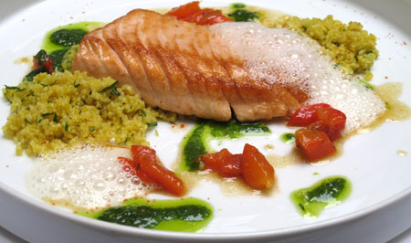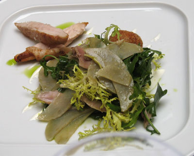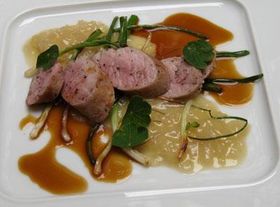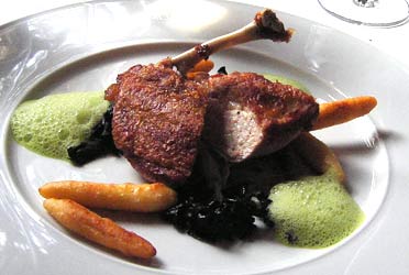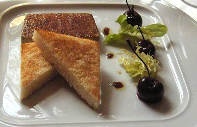 Die Speisekarte selbst hatte ich zunächst mit gemischten Gefühlen studiert, kaum kräftige Fleischgerichte, dafür viel Geschmacksarmut verheißendes Vegetarisches. Als Gruß aus der Küche überzeugte dann aber sofort ein heißer, leicht panierter Nugget vom Hasen. Ebenfalls nicht zu verachten die Vorspeise, bestehend aus zweierlei Gazpacho mit gefülltem Calamaretti und Wassermelone - wenngleich eine Ajo blanco (kalte, weisse Suppe aus süßen Mandeln und Knoblauch) kaum unter den Begriff 'Gazpacho' passt. Dafür musste sich die kühle Köstlichkeit geschmacklich nicht hinter einer Ajo blanco verstecken, wie sie in Andalusien serviert wird. Zur Crème brûlée von der Entenstopfleber mit Pfefferkirschen und Brioche lässt sich nur ein einziges Wort sagen: Grandios! Besser abgestimmt und runder auf der Zunge geht es kaum. Die Vorspeisen schlugen mit jeweils 15,- Euro zu Buche.