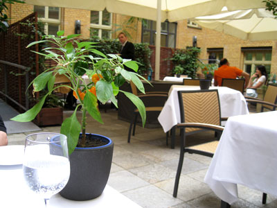 Immerhin adelt der Gault Millau 2010 das Berliner VAU mit 17 von 20 möglichen Punkten, da schien es uns angemessen, in dem sehr nett am Gendarmenmarkt gelegenen Restaurant auch für den Mittagstisch zu reservieren. Die Vorsichtsmaßnahme erwies sich als unnötig, denn mitten in der Ferienzeit war kaum ein Drittel der Plätze besetzt - und im Innenhof wegen dunkel dräuender Regenwolken nicht eingedeckt.