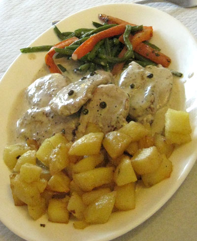 das Schweinefilet mit grünem Pfeffer in Sahnesauce, sehr zart und gut