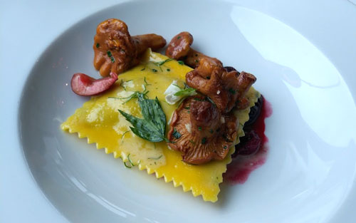 Die "Büffelricotta-Ravioli mit Liebstöckel, Kirschen und Pfifferlingen"