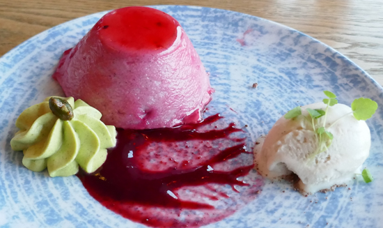 "Waldbeeren Dôme, Pistazien Chantilly und Vanilleeis" könnte als Muttis