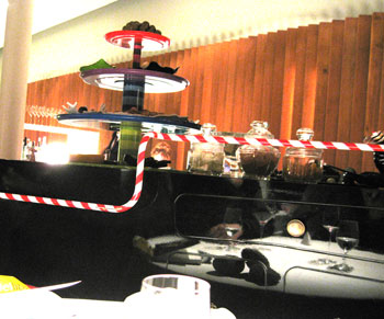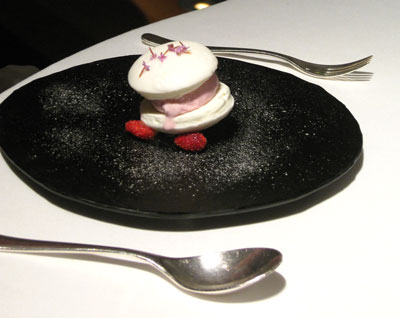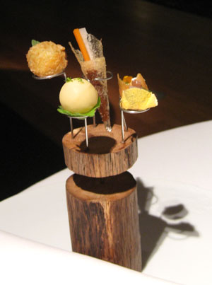 Vorspeisen und Nachspeisen, teilweise mit monströsen Pinzetten zu essen.
