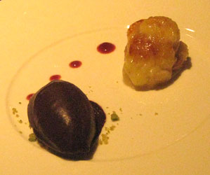 eine Nocke aus Tomaten-Basilikum-Moussee mit etwas Balsamico serviert,