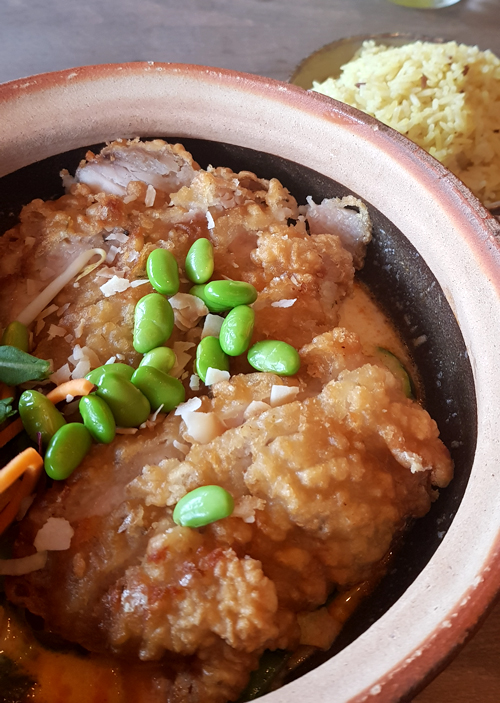optisch schön gelb aussehendem Reis und jeder Menge Kokosmilchsauce