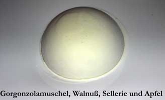 Die Muschel bestand aus Gorgonzola-Eis und passte gut zur Füllung, insbesondere zum säuerlichen Apfel. Natürlich gibt es auch Sachen, die nicht so recht munden wollen, wer immer sie auch wie großartig zubereitet. Meine Angetraute konnte sich mit dem Anchovis-Filet überhaupt nicht anfreunden und ich selbst empfand den Austern-Joghurt durchaus als Zumutung.