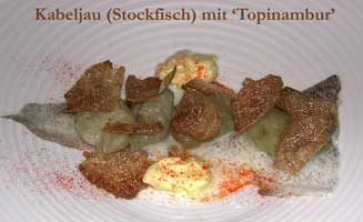 Wer Stockfisch widerlich findet, wird von Herrn Adria eines besseren belehrt, auch wenn die als 'Topinambur' bezeichneten Trüffel dazu nicht wirklich passten: