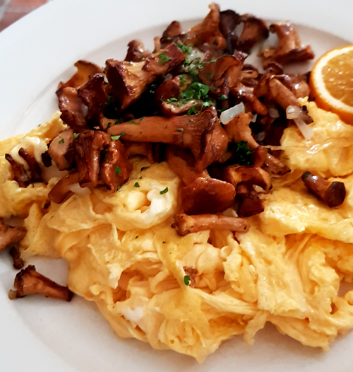 "deswegen hab ich mir die Pfifferlinge mit Rührei bestellt." Die ihm