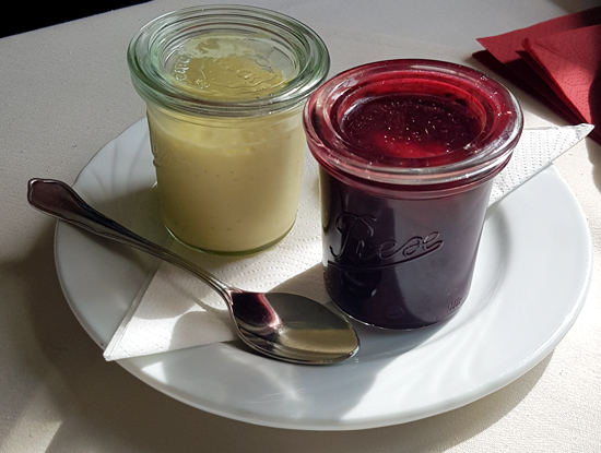 Schlagsahne und einem dazugereichten Glas mit Pflaumenkompott, das man