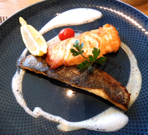 Ebenfalls etwas langweilig, aber von tadelloser Qualität das Fischduett, "gebratene Fischfilets | Senfsauce | Bratkartoffeln" (23,50 €). Die saftigen Filets bestanden aus Zander und Lachs, die knusprigen Bratkartoffeln brachten ein herrlich rauchspeckiges Aroma mit: