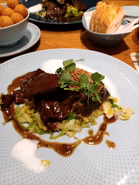 Leider kamen die im Extraschälchen servierten, runden Kroketten reichlich hart daher. Das vegetarische Pilzragout überzeugte mit wunderbarer Konsistenz und köstlicher Schmatzigkeit, war aber so schwer, dass wir an Nachtisch nicht einmal zu denken wagten und lieber einen Aquavit bestellten:
