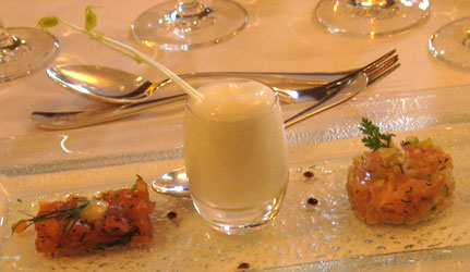 zweierlei Tatar vom Wildlachs mit Spargelsprossen und Spargelespuma -