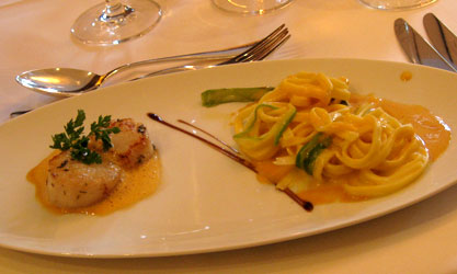 vom grünen Spargel mit gebratenen Jakobsmuscheln und Safran-Hummerschaum