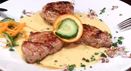 Eine Erklärung lieferte dann aber Hauptgang, das "Schweinefilet in Orangen-Pfeffer-Schmand": Wir haben nicht für möglich gehalten, jemals ein Filet derart trocken auf den Teller zu bekommen, dass nicht einmal die doppelte Menge Schmand geholfen hätte - für € 14,80 ein wahrlich unterirdischer Gang: