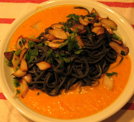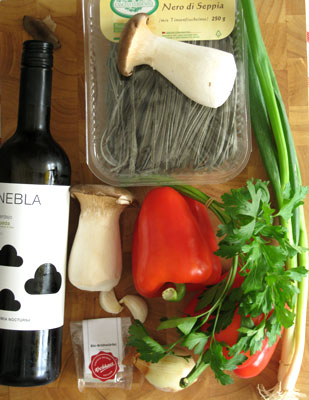 Beim zweiten Besuch (November 2012) im Kochhaus wurden wir nicht recht glücklich. Wir entschieden uns für "schwarze Tagliolini in Paprikaschaumsauce mit gebratenen Kräuterseitlingen inkl. aller Zutaten, dem passenden Nebla-Wein samt Foto-Rezeptanleitung" zum Preis von 21,20 Euro: