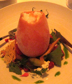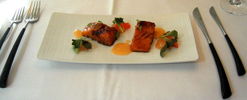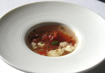 Der sanft pochierte Lachs kam dann sehr zart, sehr saftig daher, die Mini-Salatblättchen schön würzig. Lakritze war nur verhalten durchzuschmecken, Salz wäre vielleicht besser gewesen. Die kandierte Grapefruit verlieh der Komposition Frische und Fruchtigkeit - ein erfreulicher Auftakt: