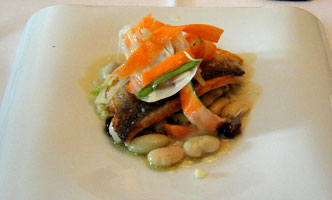 Einen zwiespältigen Eindruck hinterlässt das Design-Besteck. Es sieht zwar höchst originell und zierlich aus, hält sich jedoch wegen der schmalen Abmessungen nicht besonders angenehm in der Hand und lässt sich nicht so richtig gut verwenden. Einen Loup de Mer kann man besser kaum zubereiten, die Haut sehr knusprig, innen saftig und vollmundig. Das Gemüse, Möhrenschnitze, weiße Bohnen, roh und gegart, mit weißem Balsamico, war knackig und bildete mit der säuerlichen Note eine feine Abrundung. Allerdings sind Bohnen niemals eine echte Offenbarung, und die kleinen Nudeln als Fischunterlage waren es auch nicht: