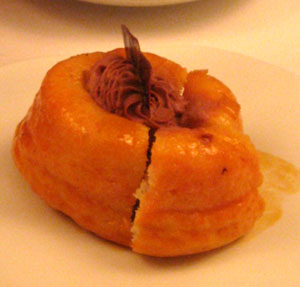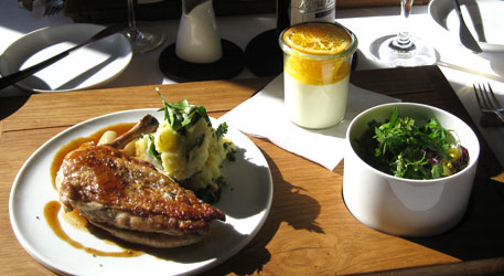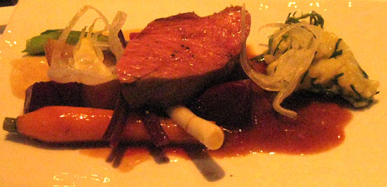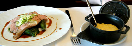 Der Tranche Kalbskarree gebührt jedes Lob, beste Fleischqualität und sehr zart. Die winzigen, eingelegten Zucchini dürften selbst eingefleischte Zucchinifeinde zu Konvertiten machen - die grünen Dinger verwendet man sonst ja nur als geschmacksfreies Füllmaterial für Salate. Gut dazu passten die in Rotwein geschmorten Schalotten, weniger gut die Polenta im Extratöpfchen, die im Mund ein seltsames Gefühl von Milchreis hinterließ: