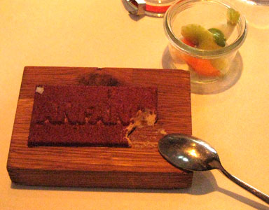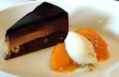 Für den Nachtisch, ein Törtchen mit Alpacoschokolade/ Karamell/ Tahitivanilleeis gibt es eine glatte 2, lecker der Pfirsich, etwas zu dünn im Verhältnis zum kräftigen Schokoladenaroma jedoch dessen Marinade. Gelungen das Nuss-Unterteil des Tortenstücks: