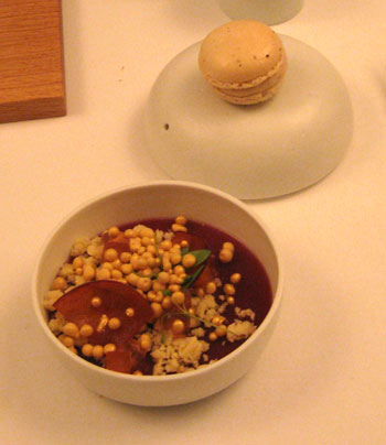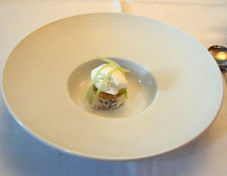 Der zart aufgeschäumte, mit Pflaumengelee bedeckte Lebermus überzeugte auf ganzer Linie. Sehr feiner Geschmack, von der Pflaume gerade eben NICHT erdrückt. Dazu ein Macaron in allerbester Qualität, nur eben nicht süß gefüllt, sondern mit einer Schicht der Entenlebercreme. Für uns eines der Highlights des Menüs, wir hätten uns gern noch ein Sixpack Macarons für zu Hause einpacken lassen, am Nebentisch allerdings mäkelte jemand, er würde "kaum etwas von der Leber schmecken". Was für ein Kenner. Optischer Gag: Zwei Macarons, ein großer (Schale mit Deckel) & ein kleiner.