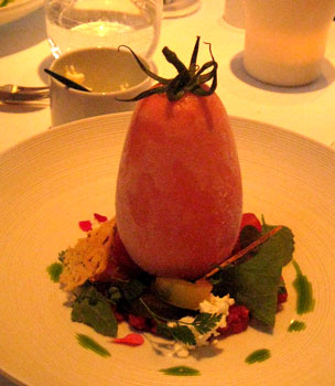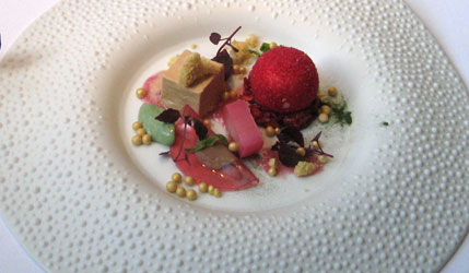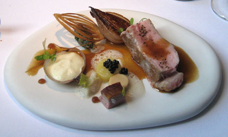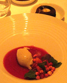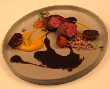 Der zweite Kracher an diesem Abend: Erstklassige Filetstückchen, auf den Punkt gegart, rosa und doch mit würziger Kruste, dazu die anmarinierten Zwetschgen - besser geht es nicht. Originell: Kürbiskernöl in Form von grauen Staubkörnern. Allerdings gelingt es offenbar auch Spitzenköchen kaum, aus Kürbis etwas herauszuholen, das einen Gourmet wirklich entzücken könnte. Dazu gab es einen weichen Rioja, wiewohl etwas mehr Kraft besser gepasst hätte.