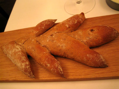 großes und ein kleines Menü an, Mittagstisch gibt es nur Sonnabends. Vorweg servierte die gut gelaunte und freundliche Bedienung lauwarmes, hausgebackenes Sauerteigbrot in Herbstblattform: