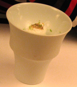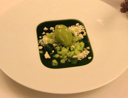 Unscheinbar auf weißem Teller wurde der weiße Ziegenkäse naturell mit Gurken-Schalottenmarmelade und ebenfalls weißem Ziegenkäseeis obenauf serviert, nicht eben ein vielversprechender Anblick. Und doch war dieser Gang auf der Zunge eine Granate, eine wahrhaft köstliche Komposition von würzigem Käse, schwach säuerlicher Marmelade und zartschmelzendem, weichem Eis, traumhaft - und leider viel zu schnell vorbei: