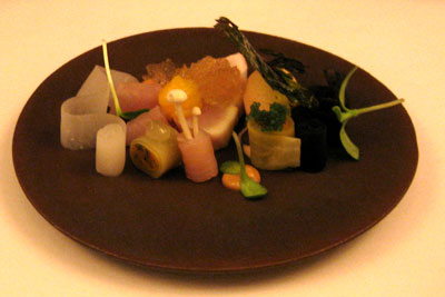 Köstliche Kleinigkeiten, die mit deutlichen Aromen und schönem Mundgefühl punkteten. Allein der Teller mit der Makrele wies eine gewisse Schwäche auf, denn der - erstklassige! - Fisch blieb hinter den übrigen Geschmacksträgern etwas zurück, besonders hinter den leicht erdigen Pilzen. Es folgte der erste Gang:
