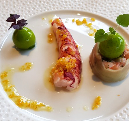Beim 2. Gang, blauer Hummerschwanz mit Avocado-Guacamole mit Koriander