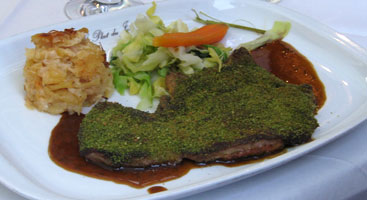 Tadellos, obschon durchgegart, die Kalbsleber mit Senfkruste, auch wenn