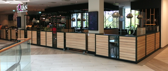 Einkaufszentrum von asiatischen Restaurants und Imbissen geradezu