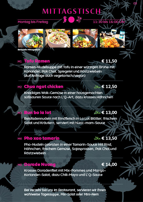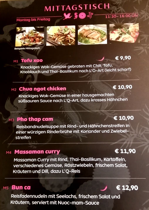 Mittagstisch mit fünf Gerichten zur Auswahl, nämlich von 11:30 bis um 16 Uhr.