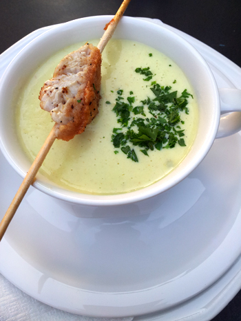 Vorneweg orderten wir ein Wasabisüppchen mit einem Hähnchen-Saté-Spieß
