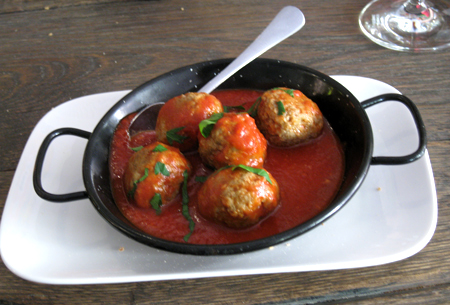 Wir traten am frühen Nachmittag ein und wunderten uns zunächst, dass man hier unter Tapas auch Thüringer Würstchen versteht. Entschieden haben wir uns dann aber doch für Datteln im knusprigen Speckmantel und sehr gelungene Albóndigas, die in nicht zu matschiger Konsistenz mit Majoran gewürzt sehr lecker daherkamen, unterstützt von einer überraschend vollmundigen und pikanten Tomatensauce.