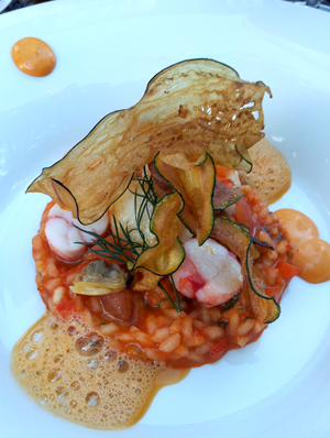 Das Meeresfrüchterisotto, ein Turm aus perfekt gegartem Reis mit