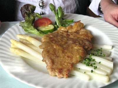 Der Spargel kam in hervorragender Qualität und Frische auf den Tisch, noch ganz leicht knackig und von aromatischer Fülle - bestens! Einwandfrei dazu das Schweineschnitzel mit feiner Panade, sehr saftig und vollkommen schier. Die Sauce Hollandaise wurde in eher mayonaiseartiger Konsistenz serviert, die geübte Zunge vermutet eines der besseren Produkte aus der Convenience-Abteilung. Rund 19 Euro sind kein Schnäppchen, aber angemessen. Wer lieber Holsteiner Schinken statt Schnitzel wählt, macht auch nichts verkehrt.