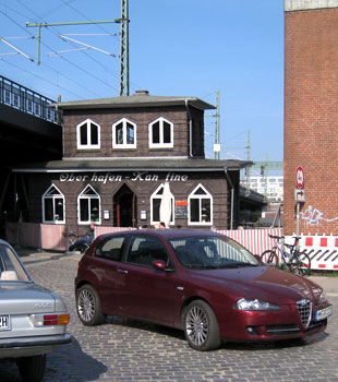 Zufällig kommt an dieser letzten Kaffeeklappe niemand vorbei, wenn er nicht gerade als Hafenarbeiter schafft. Von einer riesigen Baustelle (Hafencity) umgeben und auch sonst nicht leicht erreichbar, finden sich hier in erster Linie Touristen ein oder Zeitgenossen, die Lust auf etwas Originelles verspüren. Beim Betreten des in sich völlig schiefen Gebäudes kommt sofort Seekrankheit auf, es scheint keinen einzigen rechten Winkel zu geben. Aber bei schönem Wetter kann man auch draußen sitzen, allerdings müssen Gespräche wegen der alle paar Minuten vorbeipolternden Züge und Laster oft unterbrochen werden.