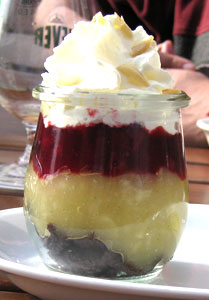 Die rote Grütze zum Nachtisch erwies sich als fein abgewogene Mischung aus Fruchtigkeit und zurückhaltender Säure, mit 4,50 Euro auch nicht zu teuer. Das Mehrschicht-Dessert namens 'verschleiertes Bauernmädel' im Weckglas sah weit ansprechender aus, als es dann schmeckte. Sahne'schleier', Apfelmus und rote Grütze waren deutlich erkennbar, die Schokosauce hingegen nicht und der Boden aus harten Schwarzbrotstücken erwies sich als geschmacksfreier Knusper.